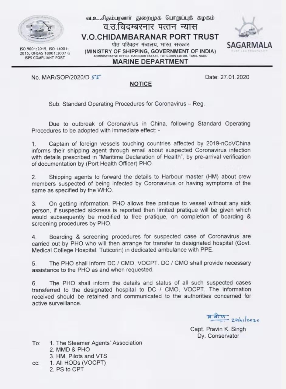 India – The Port Health Organisation Circular of 9 March concerning vessels coming from affected countries is available here. For the Statement of Policy for pre-arrival preparations (23 Feb) click here. The Ministry of Shipping’s Marine Department Notice of 27 January is available here; click here for the Notification from the Port Health Organisation courtesy of GAC (23 January).