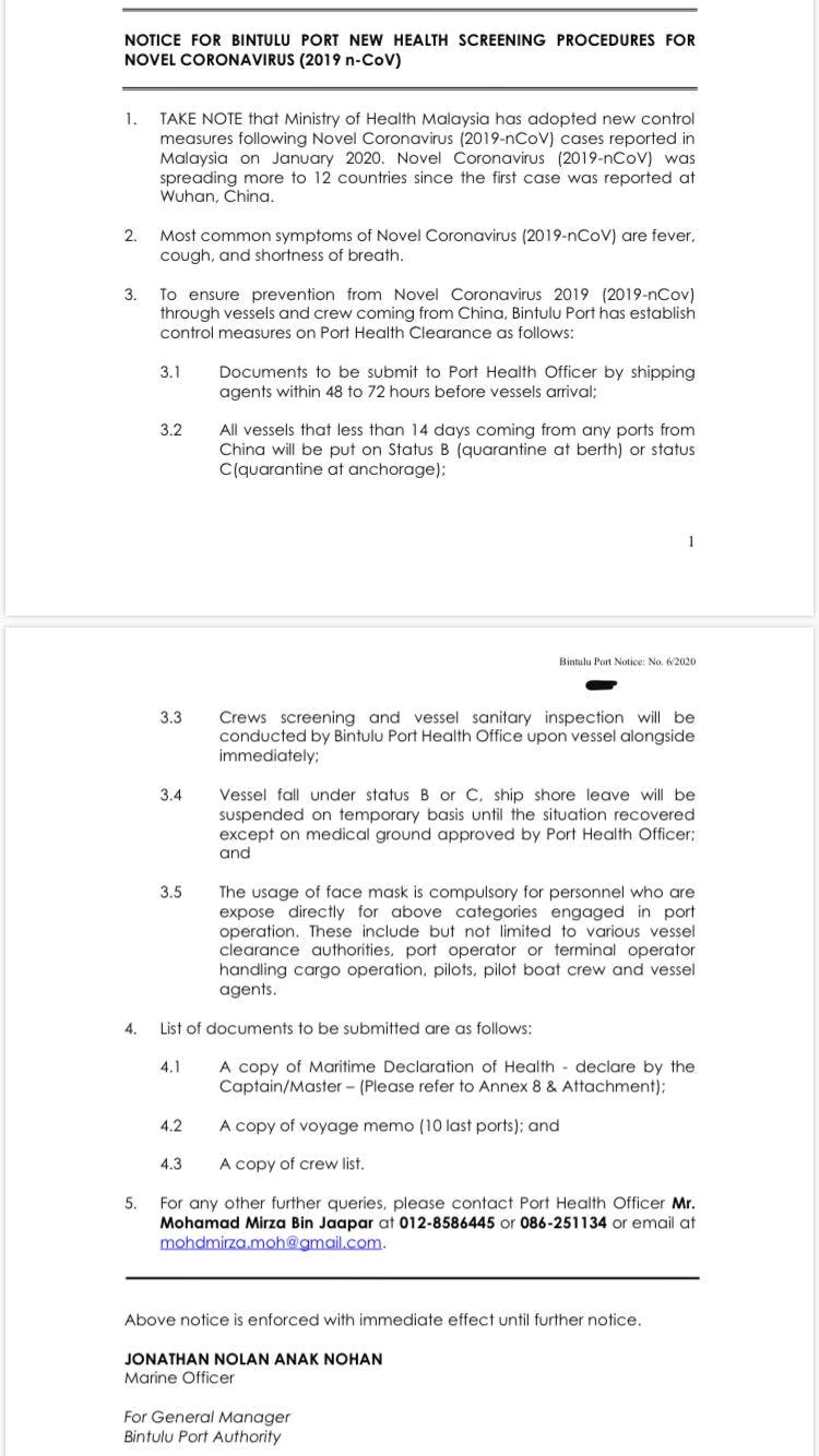 Malaysia – click here for the Bintulu Port New Health Screening procedures (notice no. 6/2020).