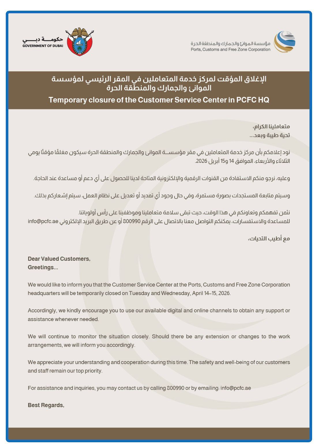 [9/3/2026 - The Government of Dubai has issued this Notice (03/2026) in respect of temporary Customs arrangements.